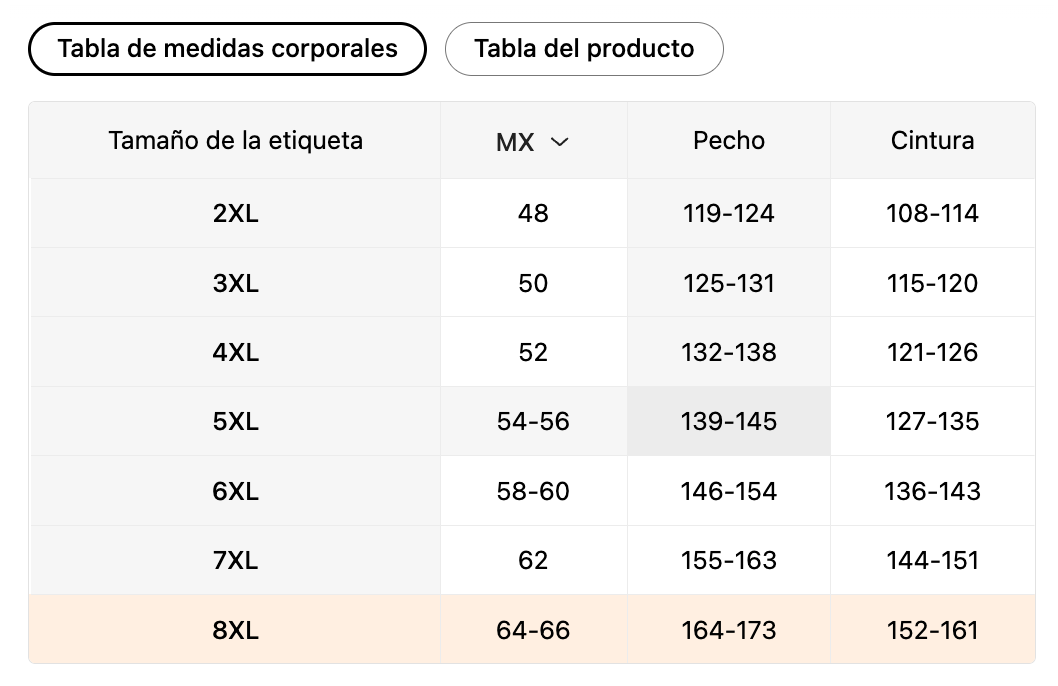 | Tamaño de la etiqueta | MX | Pecho | Cintura |
