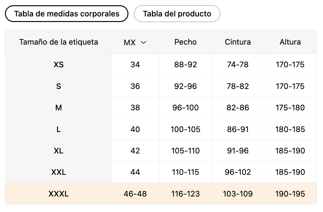 Tamaño de la etiqueta | MX | Pecho | Cintura | Altura |