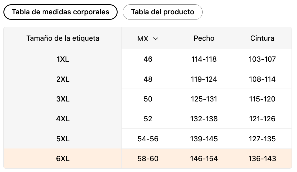 | Tamaño de la etiqueta | Talla MX | Pecho (cm) | Cintura (cm) |