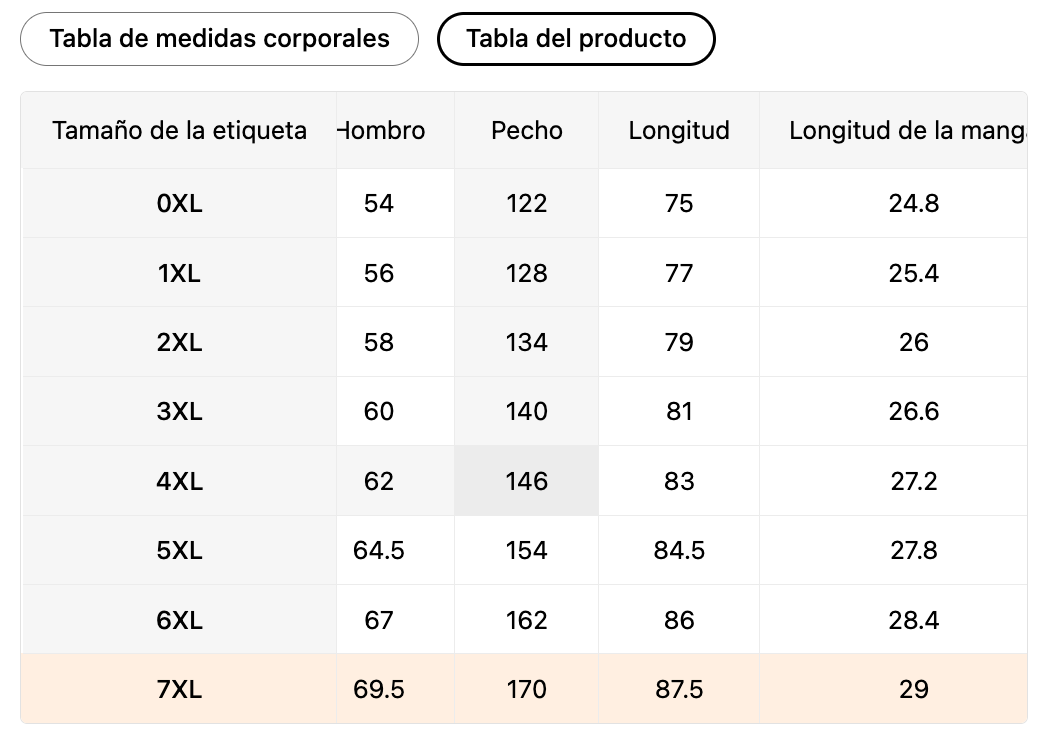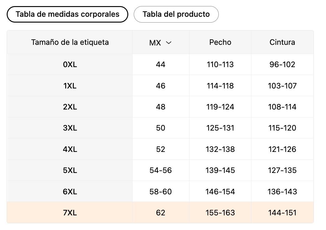 | Tamaño de la etiqueta | MX | Pecho | Cintura |