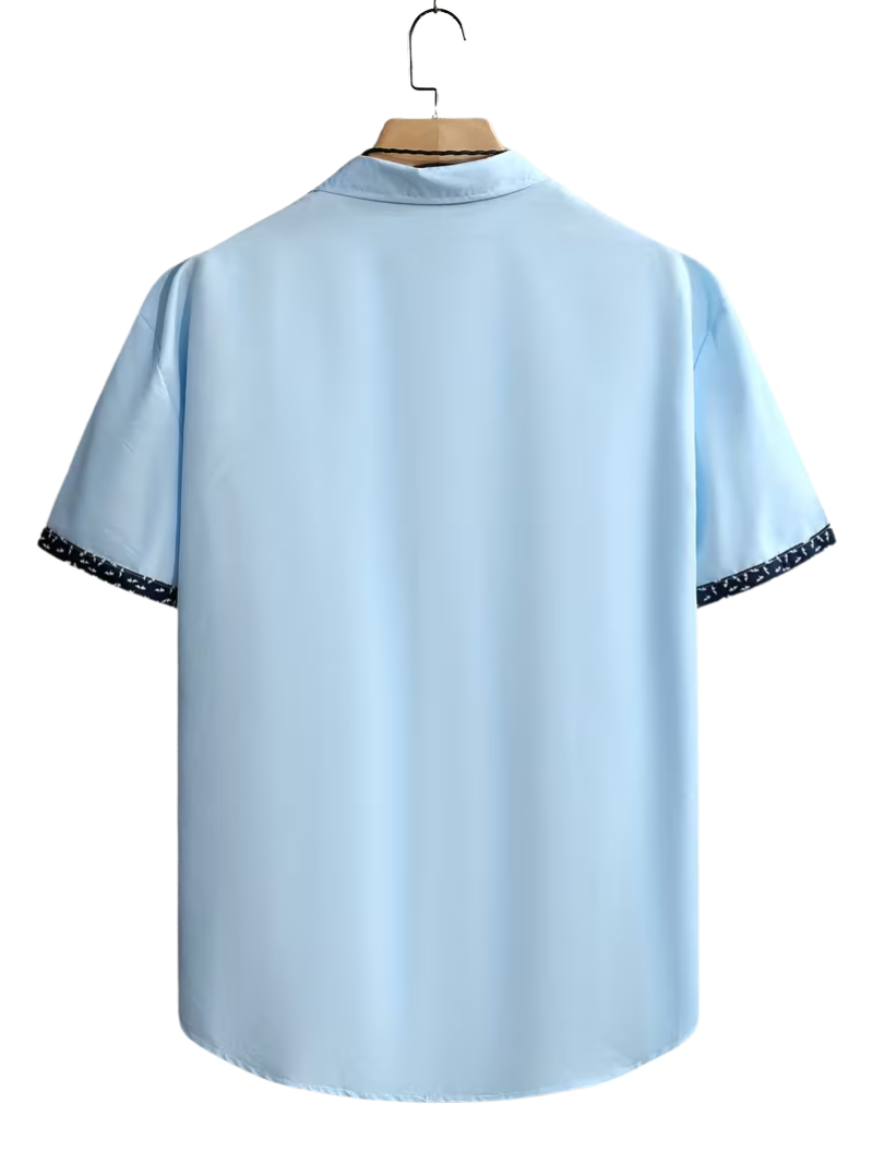 Camisa casual de manga corta confeccionada en tejido de alta calidad. Presenta un elegante diseño de bloques de color en azul claro y negro que la hace versátil para diferentes ocasiones. Cuenta con cuello de solapa, botones funcionales y bolsillos en el pecho para mayor practicidad. Su tela no elástica mantiene una estructura impecable durante todo el día, ideal para el clima cálido de verano. El corte regular proporciona comodidad sin comprometer el estilo. Se recomienda lavar a mano o limpieza en seco para preservar su durabilidad. Perfecta para crear looks casuales modernos y sofisticados.