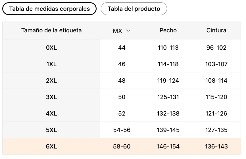 | Tamaño de la etiqueta | MX | Pecho (cm) | Cintura (cm) |