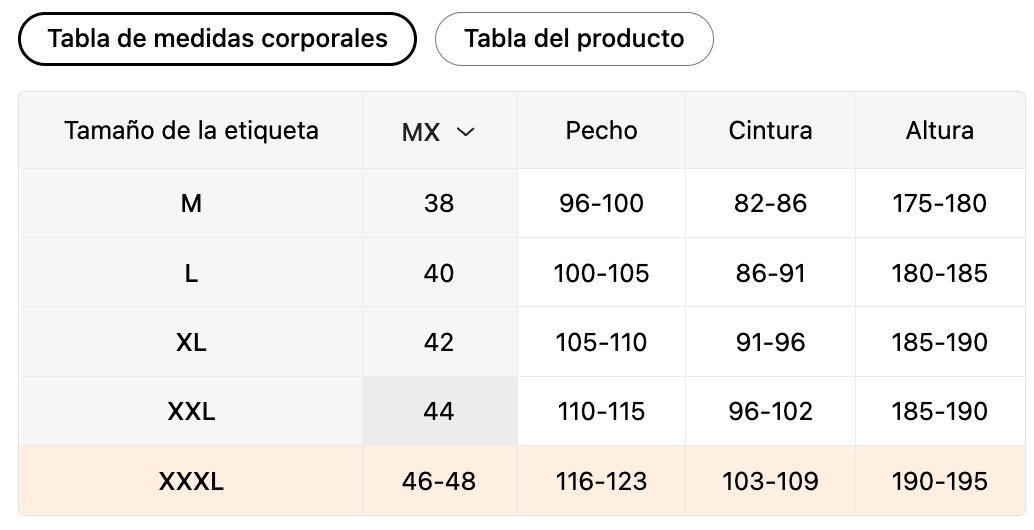 Tamaño de la etiqueta | MX | Pecho | Cintura | Altura |
