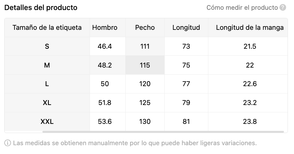 | Tamaño de la etiqueta | Hombro | Pecho | Longitud | Longitud de la manga |