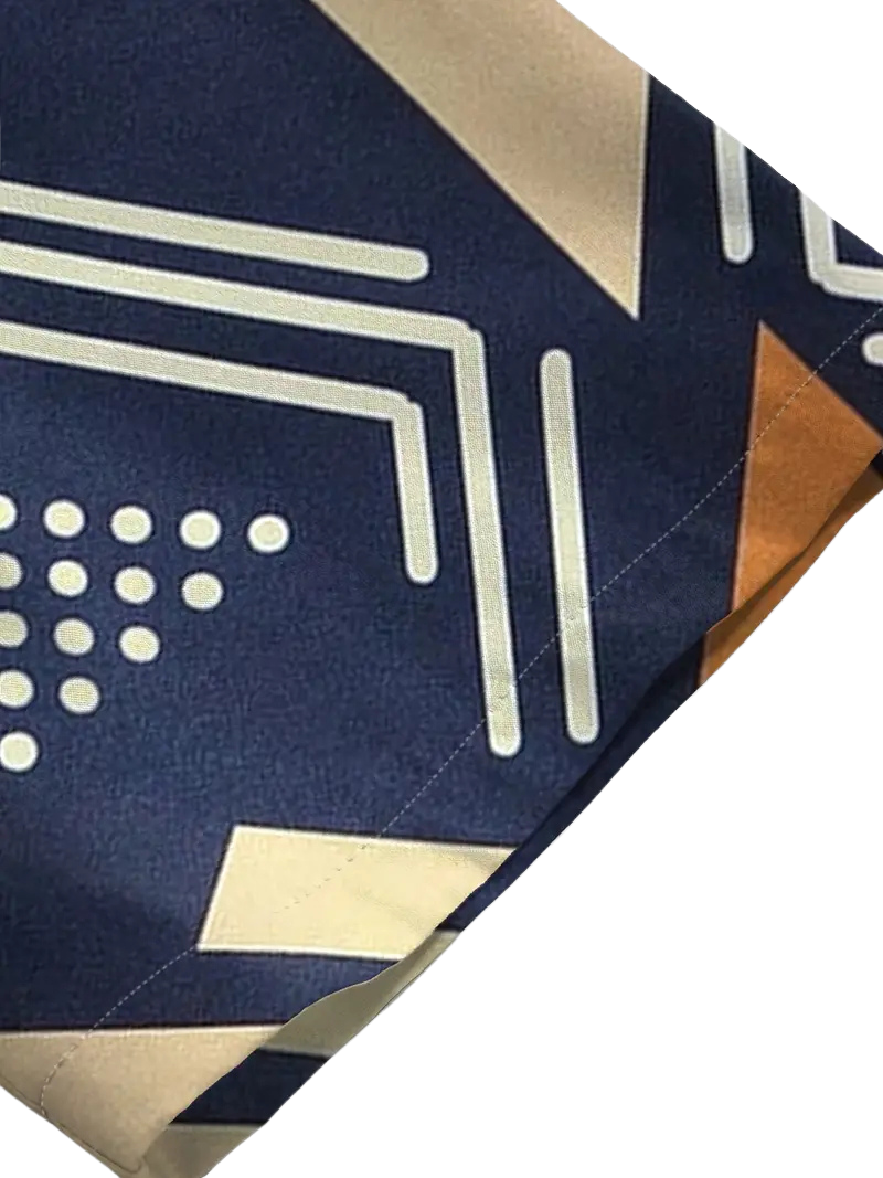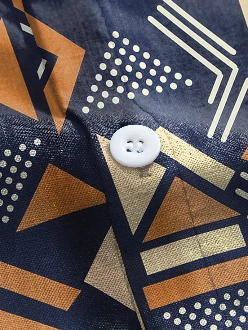 Camisa de manga corta confeccionada para mayor comodidad. Presenta un llamativo estampado geométrico en tonos azul, naranja y oro que la hace perfecta para la temporada estival. Cuenta con cuello de solapa y cierre de botones, ofreciendo un look casual versátil. La tela tejida proporciona durabilidad y mantiene su forma con el uso regular. Ideal para personas que buscan prendas con personalidad y estilo desenfadado. Fácil de cuidar, se puede lavar a máquina.