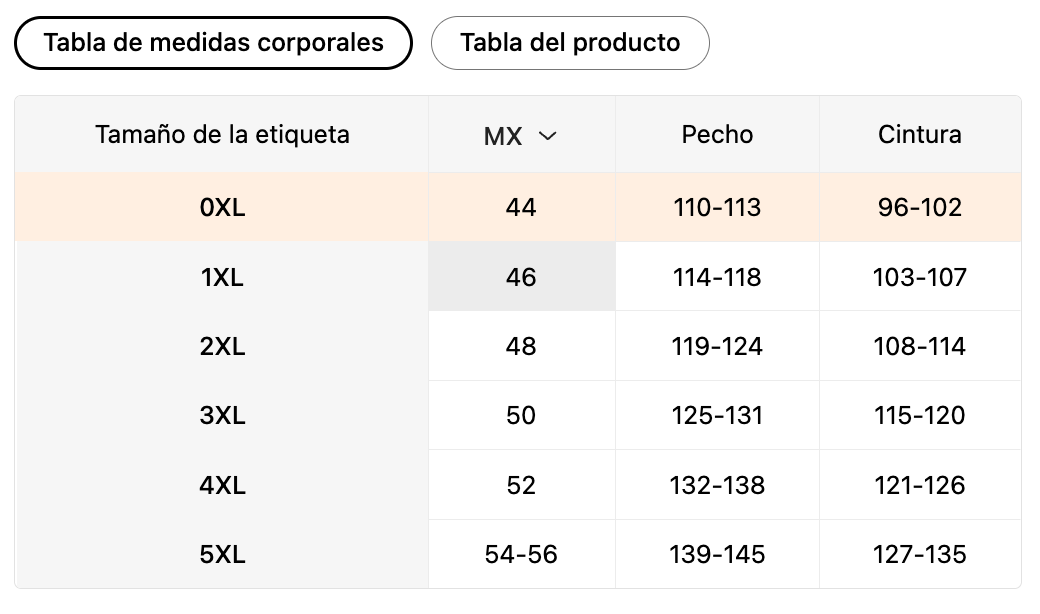 Tabla de medidas corporales - Equivalencias MX