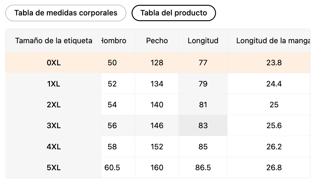 Tabla del producto - Medidas por talla