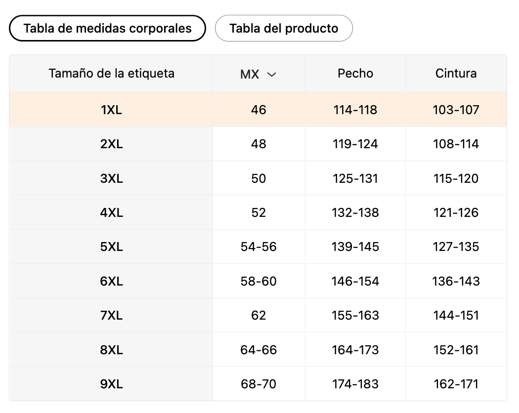 | Tamaño de la etiqueta | MX | Pecho (cm) | Cintura (cm) |