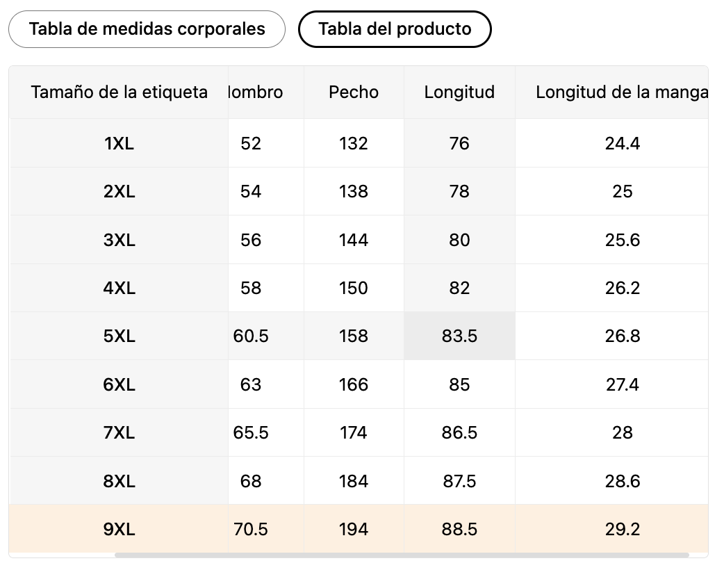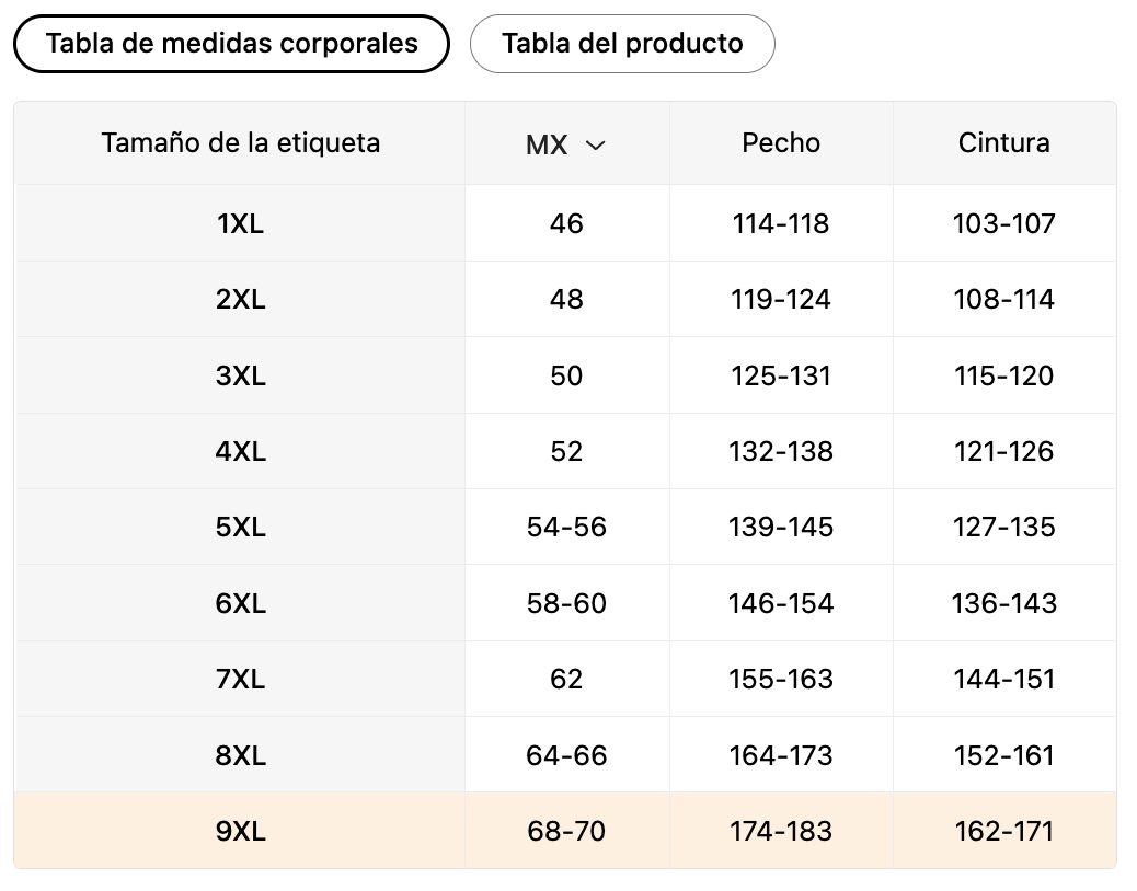| Tamaño de la etiqueta | MX | Pecho | Cintura |