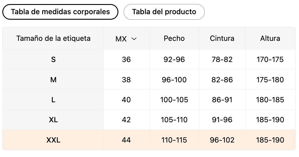 | Tamaño de la etiqueta | MX | Pecho | Cintura | Altura |