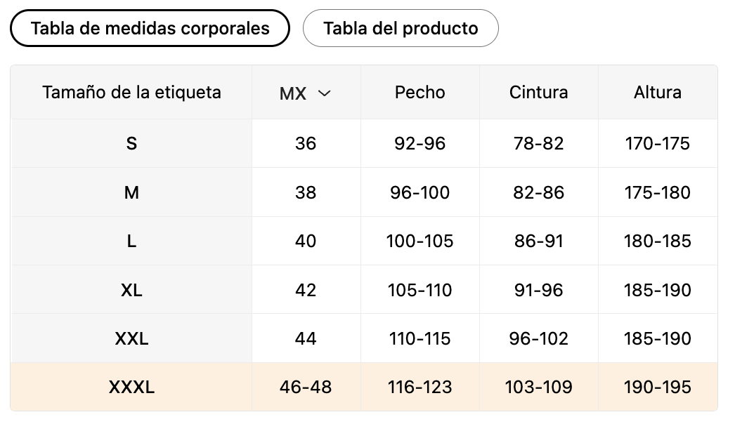 Tamaño de la etiqueta | MX | Pecho | Cintura | Altura |