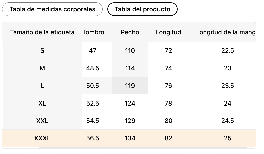 Tamaño de la etiqueta | Hombro | Pecho | Longitud | Longitud de la manga |
