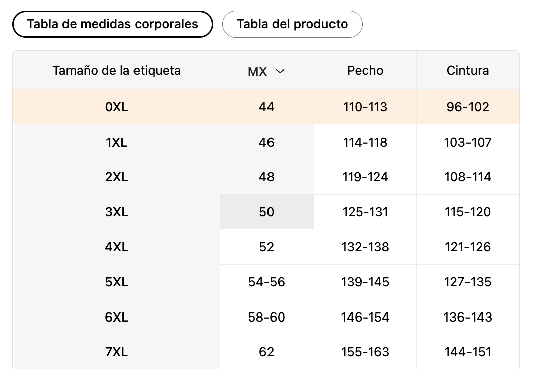 | Tamaño de la etiqueta | Talla MX | Pecho (cm) | Cintura (cm) |