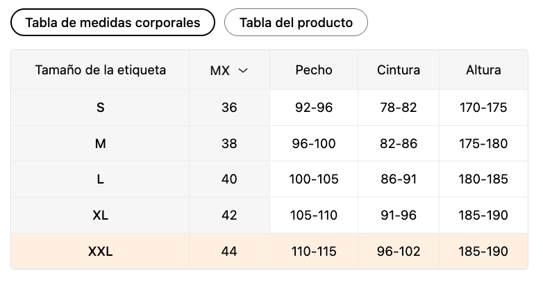 | Tamaño de la etiqueta | MX | Pecho (cm) | Cintura (cm) | Altura (cm) |