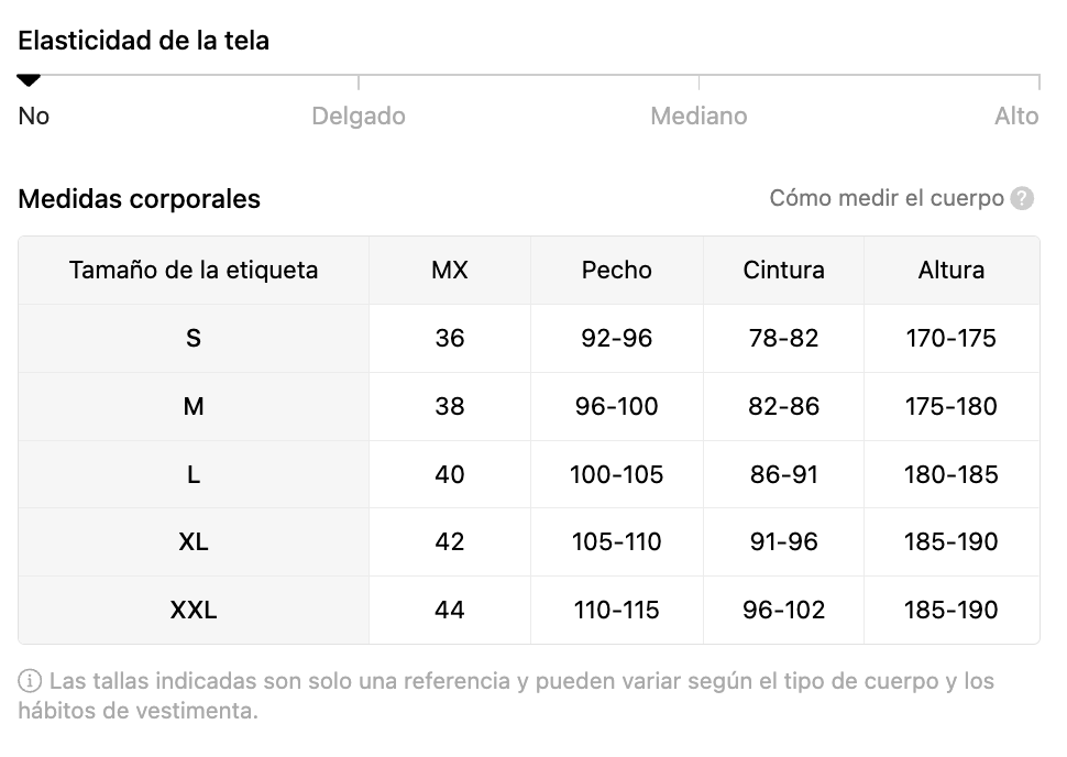 | Tamaño de la etiqueta | MX | Pecho (cm) | Cintura (cm) | Altura (cm) |