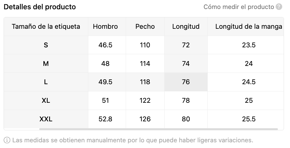 | Tamaño de la etiqueta | Hombro (cm) | Pecho (cm) | Longitud (cm) | Longitud de la manga (cm) |