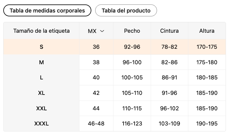 | Tamaño de la etiqueta | Talla MX | Pecho (cm) | Cintura (cm) | Altura (cm) |