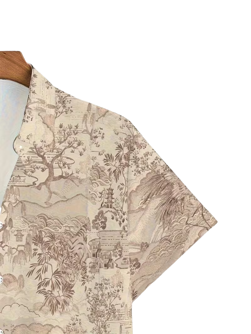 Camisa de manga corta en 100% poliéster con estampado completo de paisajes tradicionales orientales. Diseño casual con cuello de solapa y corte regular, ideal para la temporada de verano. La tela ligera con ligero estiramiento proporciona comodidad y movimiento. Perfecta para hombres que buscan incorporar arte cultural en su guardarropa diario. Fácil de cuidar: lavable a máquina. Disponible en talla grande.