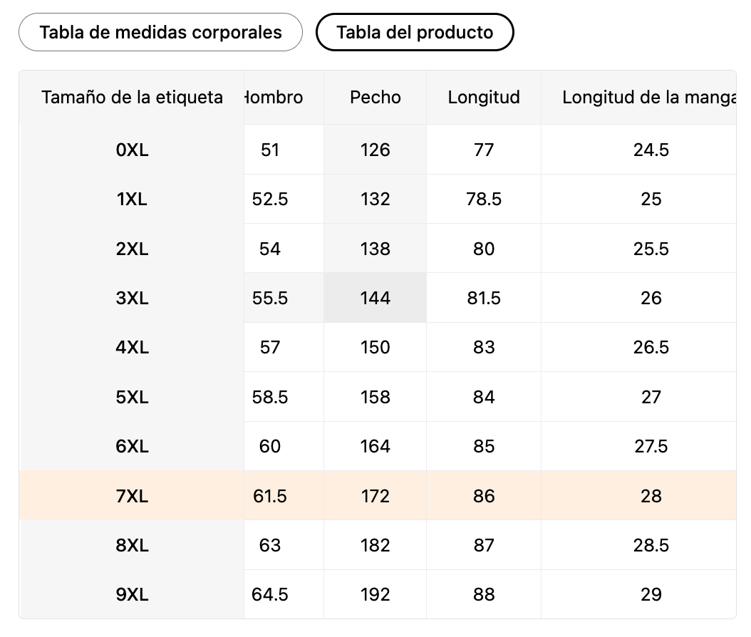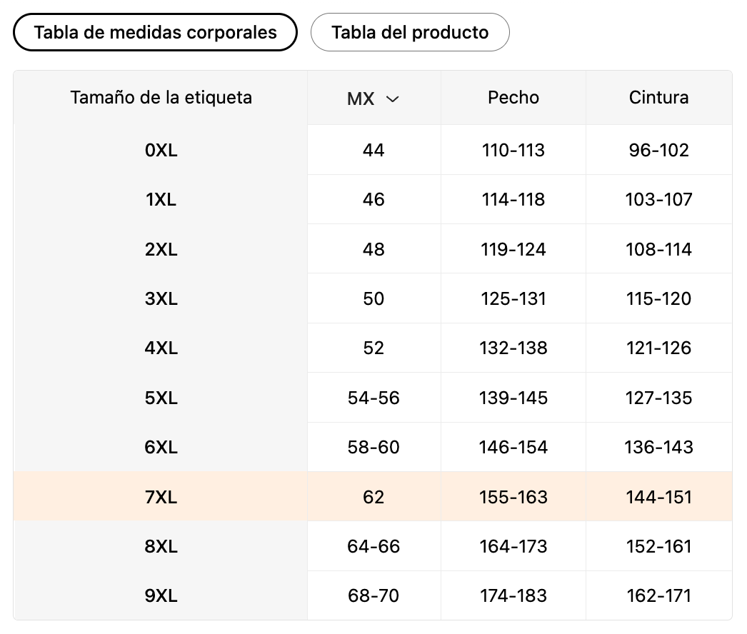| Tamaño de la etiqueta | MX | Pecho | Cintura |