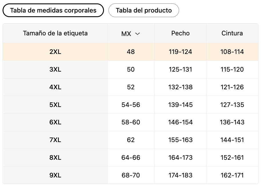 | Tamaño de la etiqueta | MX | Pecho (cm) | Cintura (cm) |