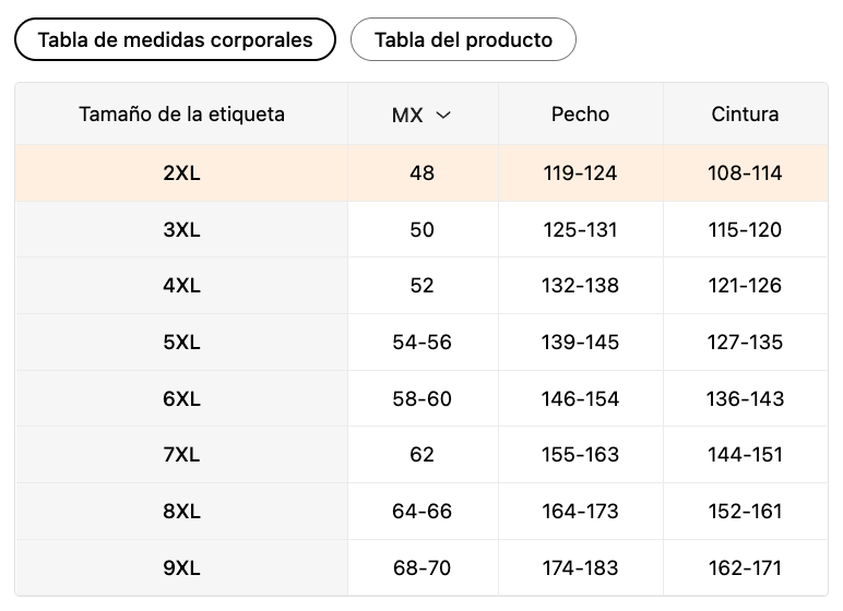 | Tamaño de la etiqueta | MX | Pecho (cm) | Cintura (cm) |