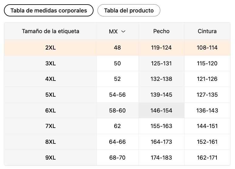 | Tamaño de la etiqueta | MX | Pecho (cm) | Cintura (cm) |