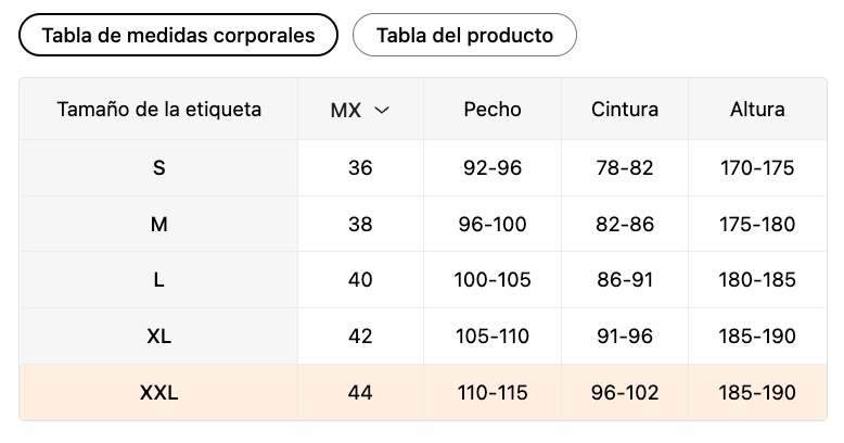 | Tamaño de la etiqueta | MX | Pecho | Cintura | Altura |