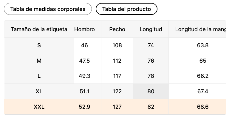 Tabla de medidas del producto