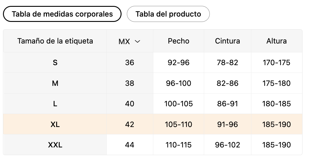 Tamaño de la etiqueta | MX | Pecho | Cintura | Altura |