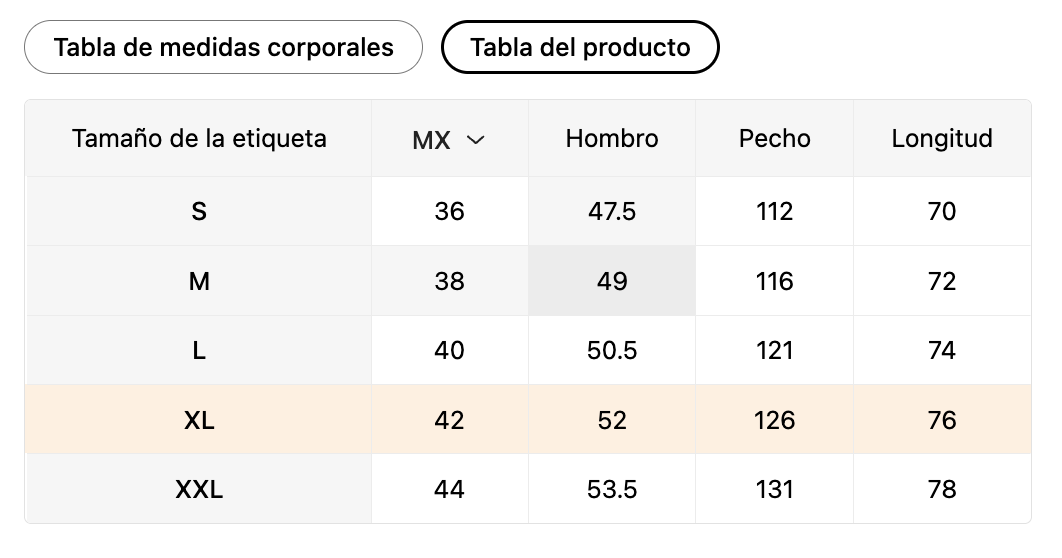 Tamaño de la etiqueta | MX | Hombro | Pecho | Longitud |