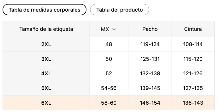 | Tamaño de la etiqueta | MX | Pecho (cm) | Cintura (cm) |
