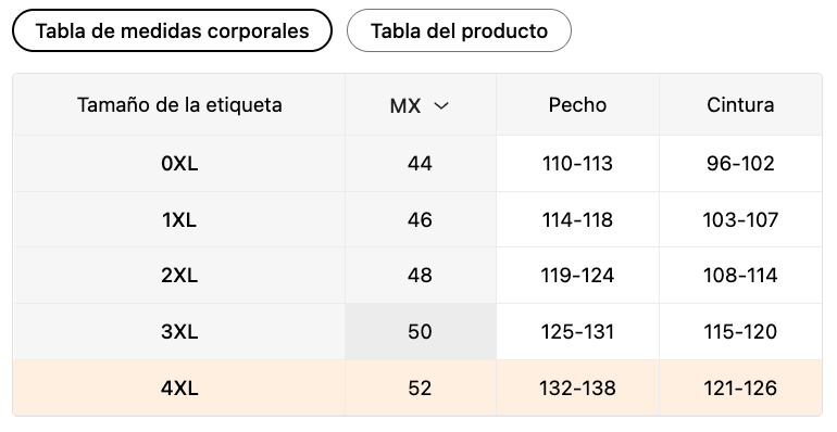 | Tamaño de la etiqueta | MX | Pecho (cm) | Cintura (cm) |