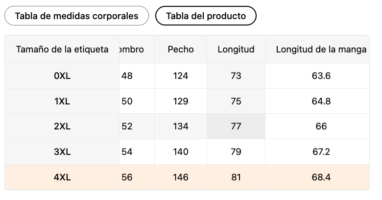 Tabla del producto (Medidas de la prenda)