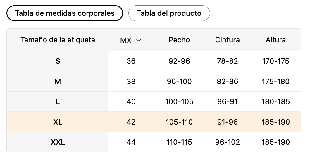 Tamaño de la etiqueta | MX | Pecho | Cintura | Altura |