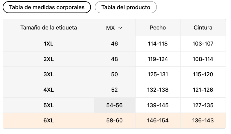 | Tamaño de la etiqueta | MX | Pecho (cm) | Cintura (cm) |