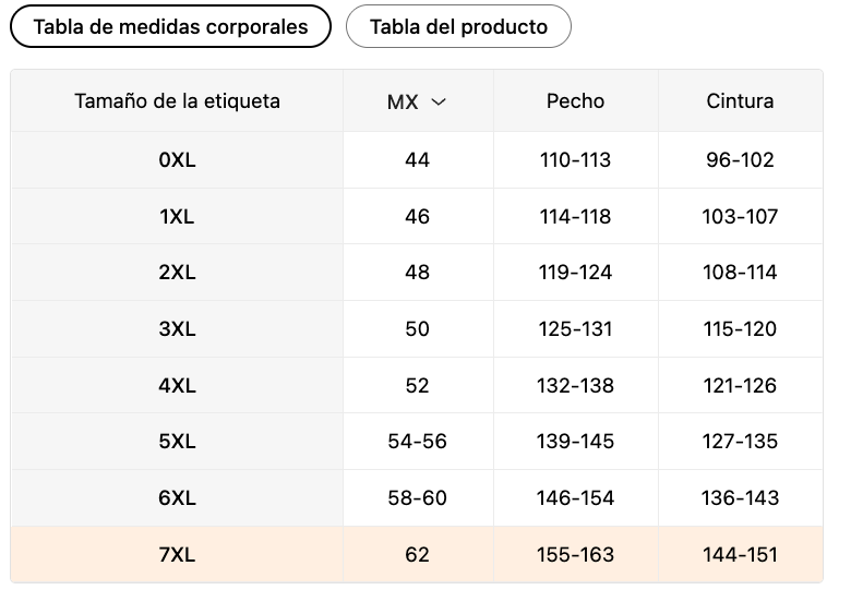 | Tamaño de la etiqueta | MX | Pecho (cm) | Cintura (cm) |