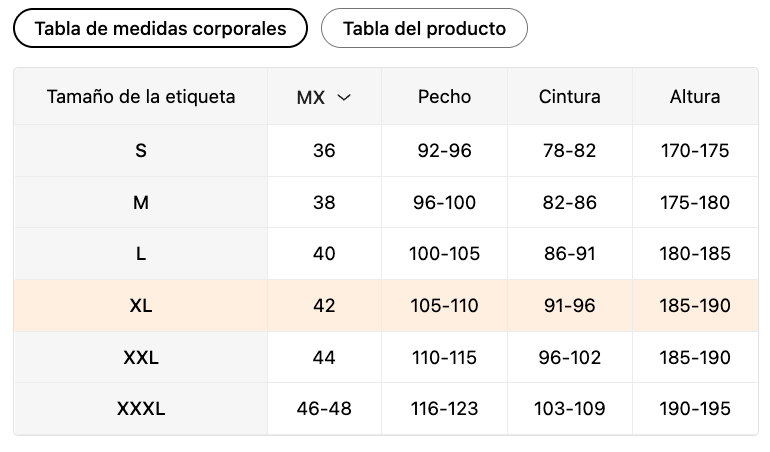 | Tamaño de la etiqueta | MX | Pecho (cm) | Cintura (cm) | Altura (cm) |