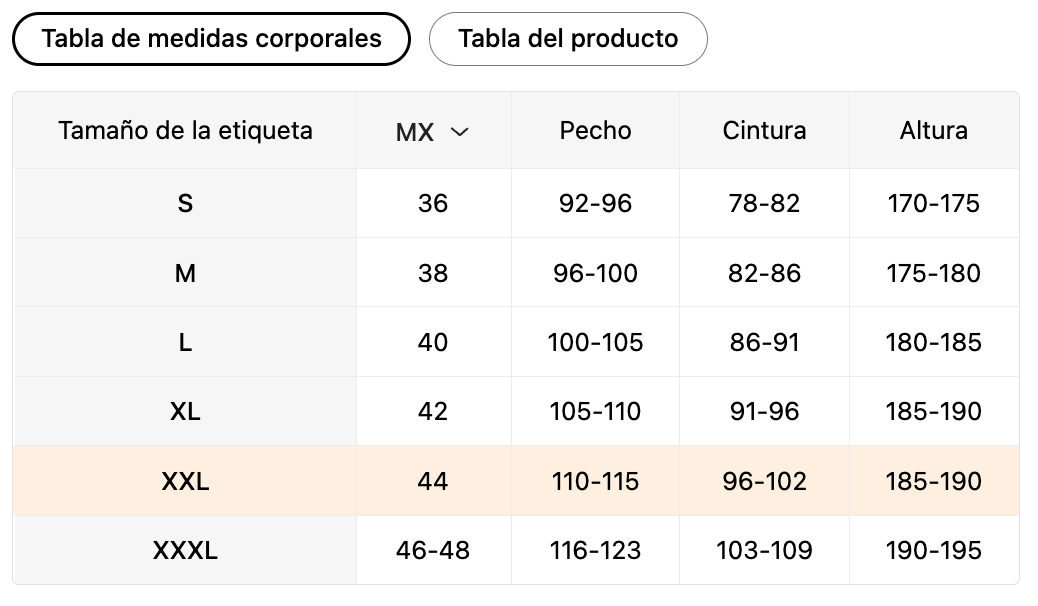 Tamaño de la etiqueta | MX | Pecho | Cintura | Altura |