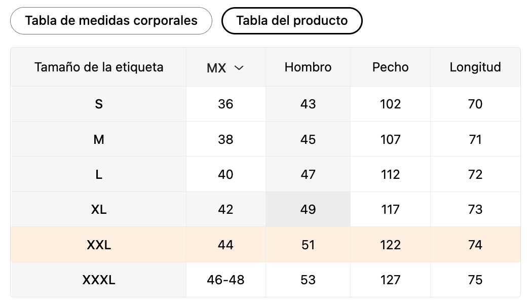 Tamaño de la etiqueta | MX | Hombro | Pecho | Longitud |