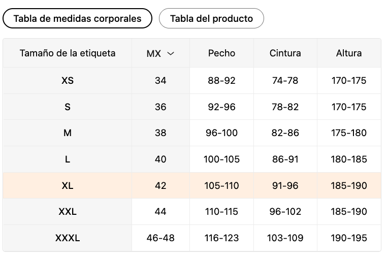 | Tamaño de la etiqueta | MX | Pecho (cm) | Cintura (cm) | Altura (cm) |