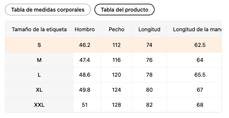 | Talla | Hombro | Pecho | Longitud | Longitud de manga |