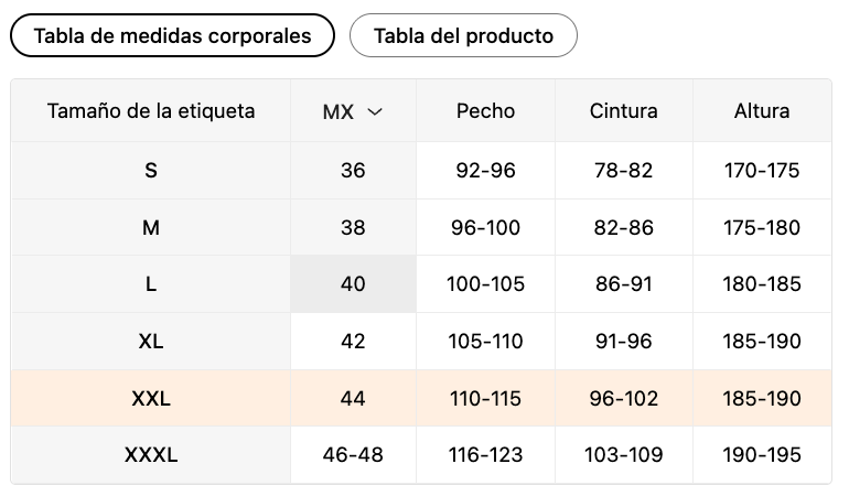 | Tamaño de la etiqueta | MX | Pecho (cm) | Cintura (cm) | Altura (cm) |