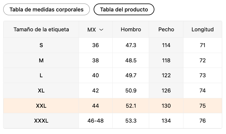 | Tamaño de la etiqueta | MX | Hombro (cm) | Pecho (cm) | Longitud (cm) |