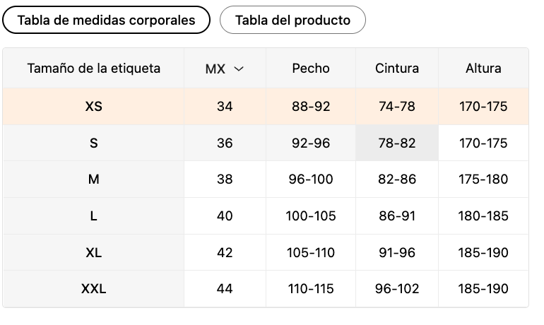 | Tamaño de la etiqueta | MX | Pecho (cm) | Cintura (cm) | Altura (cm) |