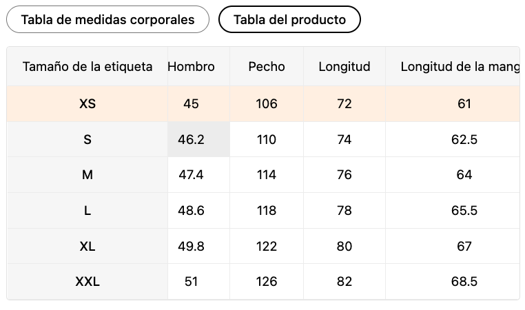| Tamaño de la etiqueta | Hombro (cm) | Pecho (cm) | Longitud (cm) | Longitud de la manga (cm) |