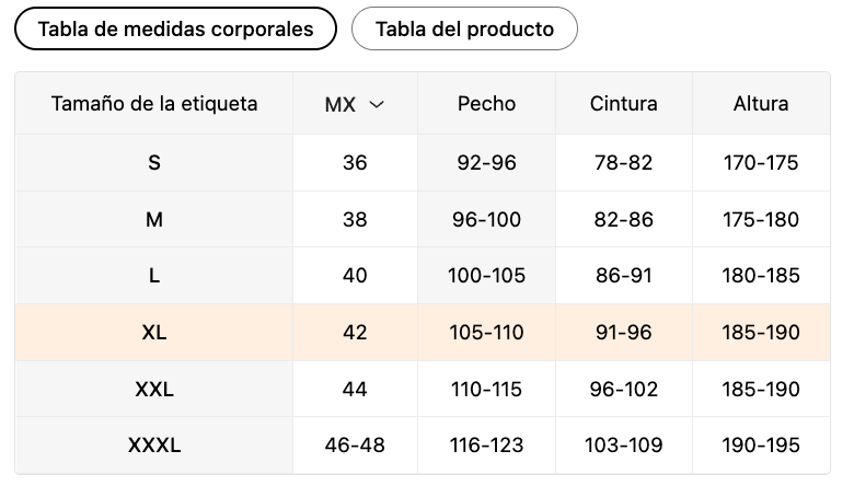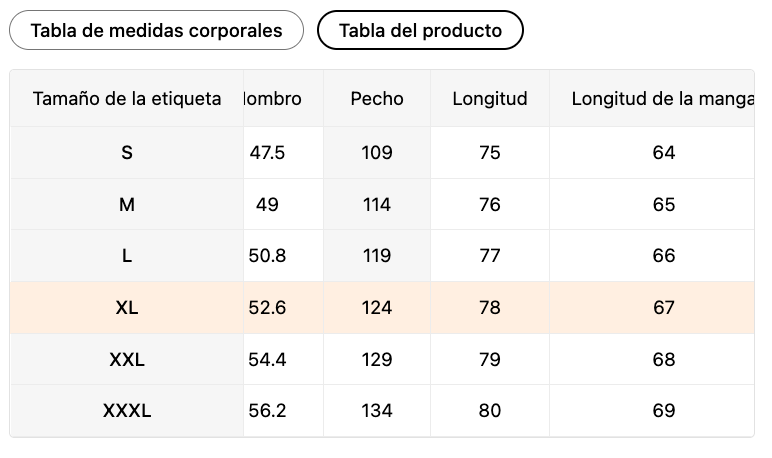 Tabla del producto – Medidas de la prenda