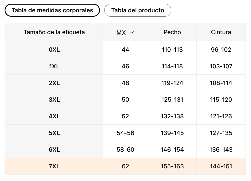 | Tamaño de la etiqueta | MX | Pecho (cm) | Cintura (cm) |