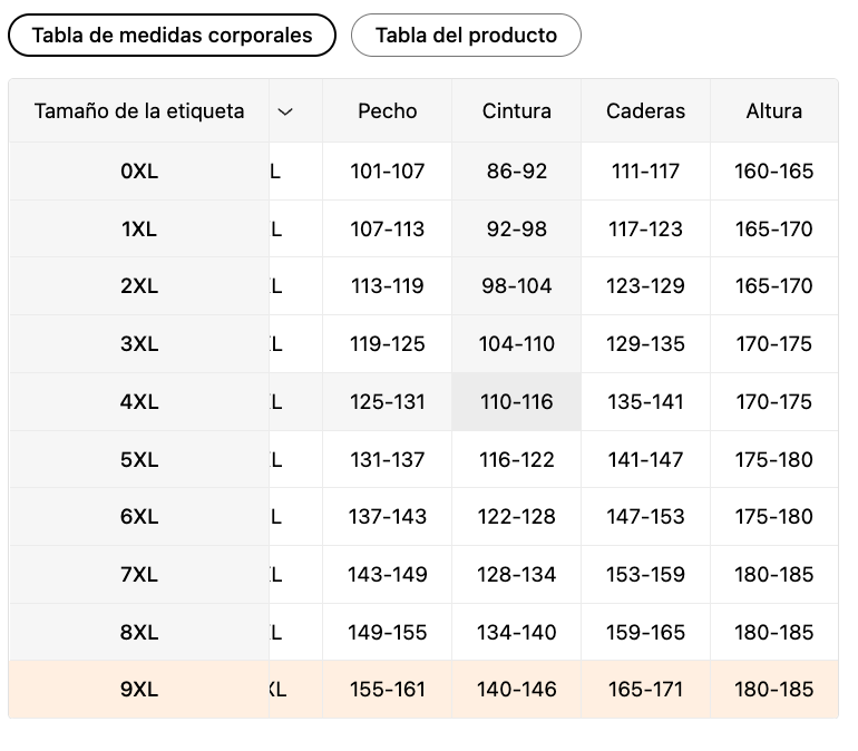 | Tamaño | Pecho (cm) | Cintura (cm) | Caderas (cm) | Altura (cm) |