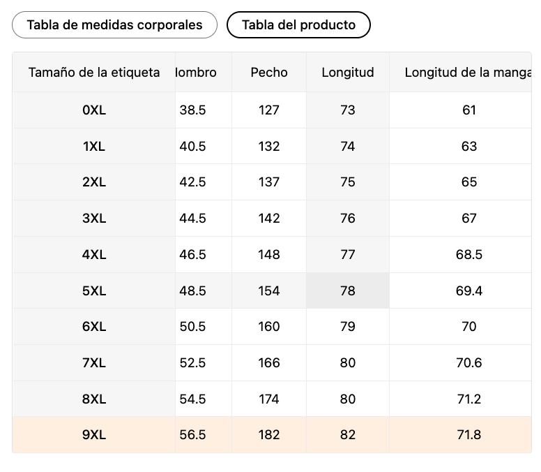 | Tamaño | Hombro (cm) | Pecho (cm) | Longitud (cm) | Manga (cm) |