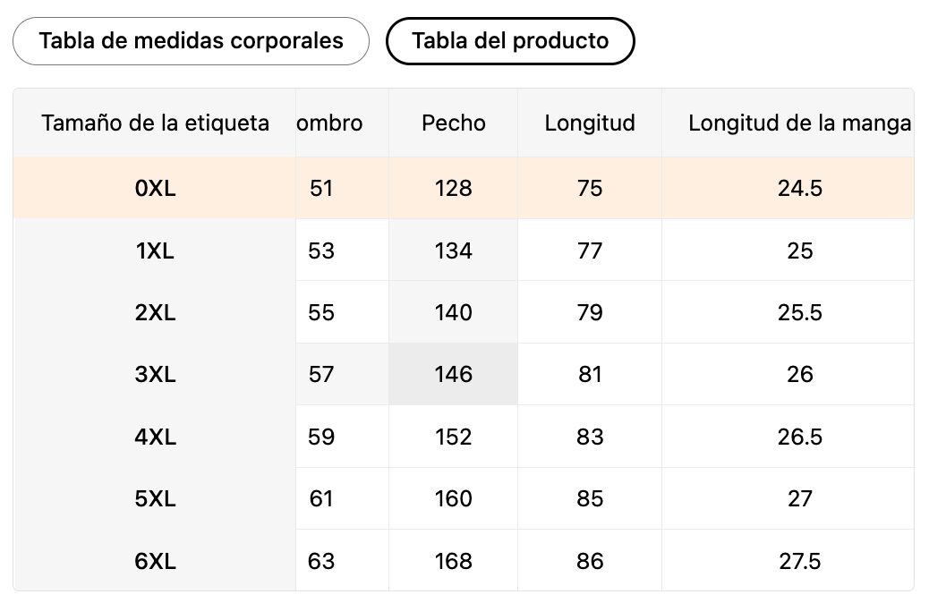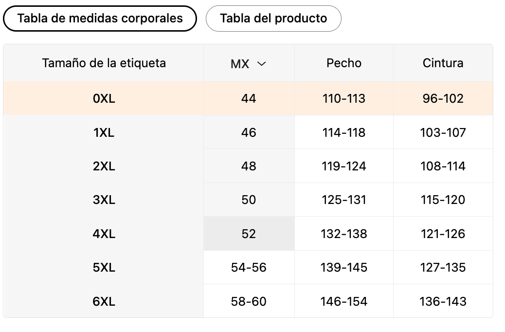 | Tamaño de la etiqueta | MX | Pecho | Cintura |